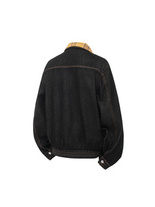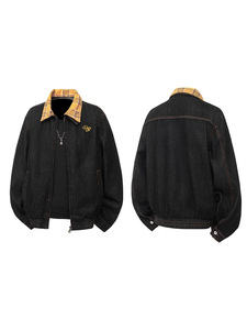格子翻领拼接美式工装拉链牛仔夹克男女高街hiphop拉链开衫外套潮