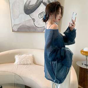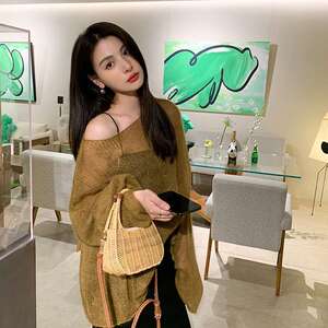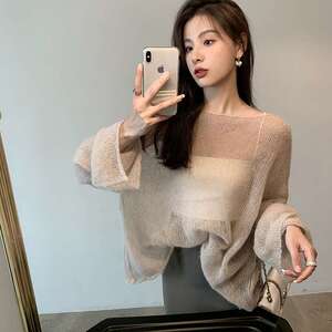 慵懒风镂空长袖针织防晒春秋款一字领露肩马海毛宽松外穿薄款罩衫