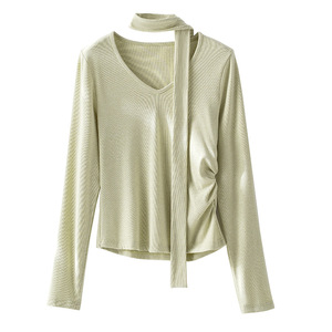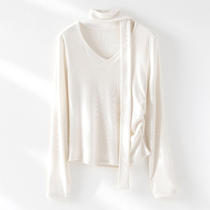 25年秋新款女装衬衫不对称别致下摆设计修身侧腰抽皱V领飘带上衣