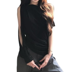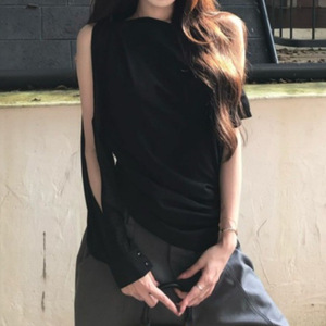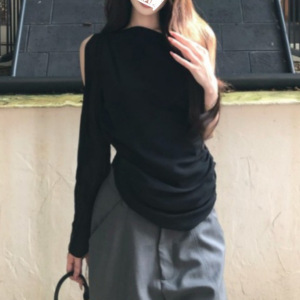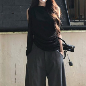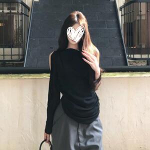 2025年早秋新款简约通勤黑色斜肩恤修身显瘦设计感纯欲上衣