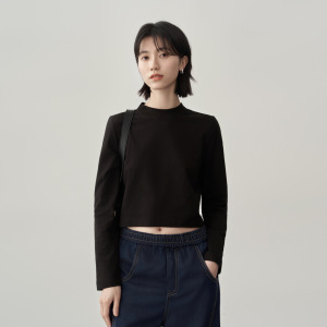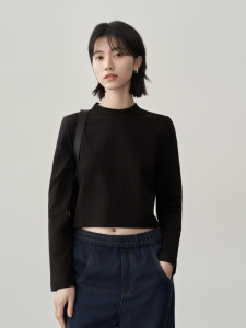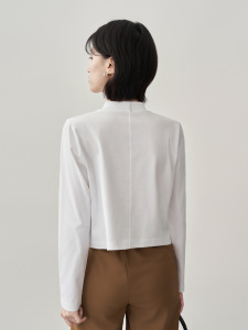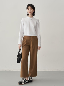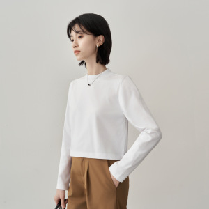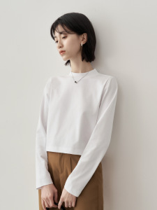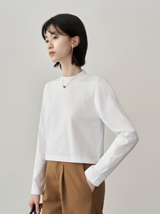 正肩半高领短款t恤女长袖休闲通勤宽松高腰露脐白T打底衫中领上衣