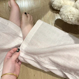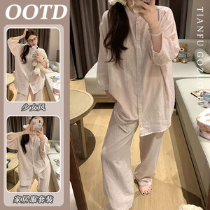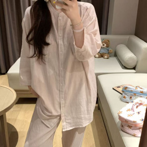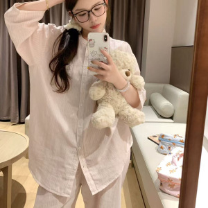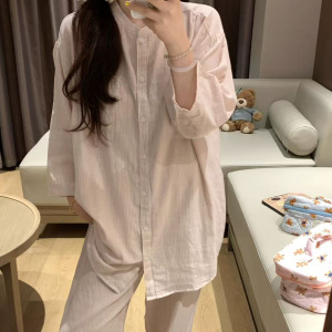 简约圆领条纹睡衣女春秋新款长袖长裤韩系甜美少女学生家居服套装