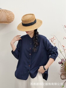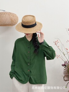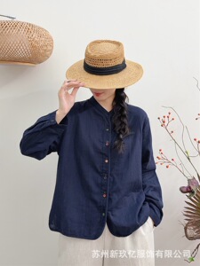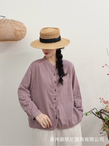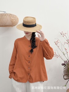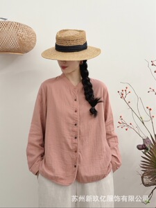 2025秋季新款立领长袖衬衫 复古纯色棉纱宽松版休闲衬衣女