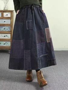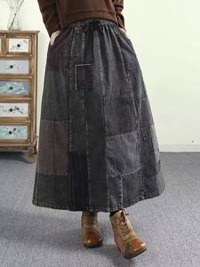 春季复古民族风贴布做旧牛仔半身裙女2025新款大码宽松A字裙中长