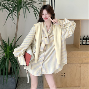 实拍黄色披肩条纹衬衫短裤套装2025秋款学院风小个子减龄三件套