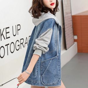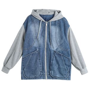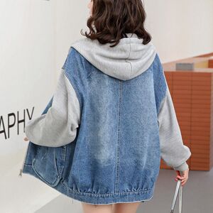 连帽拼接牛仔外套女宽松胖MM休闲显瘦减龄上衣小个子2025春秋新款