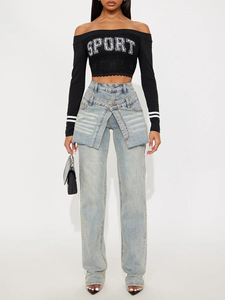 2025早秋新款欧美辣妹假两件低腰修身包臀牛仔裤女猫须洗水毛边感