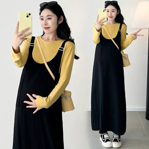 孕妇秋冬新款宽松中长款吊带连衣裙+黄色打底上衣甜美显瘦两件套