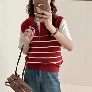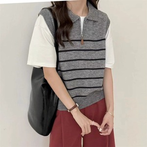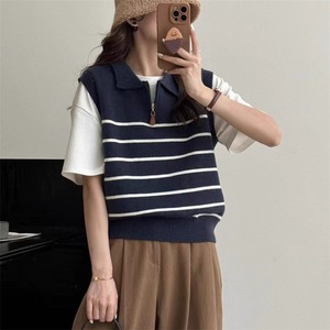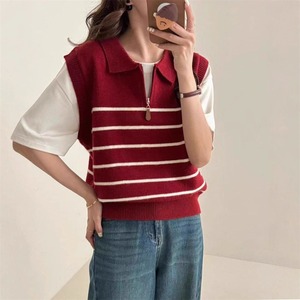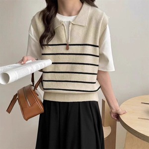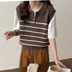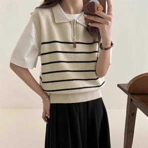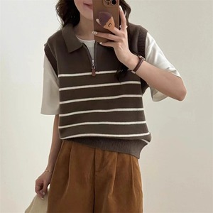 韩系复古条纹翻领拉链针织背心毛衣女秋冬内搭外穿气质坎肩上衣女
