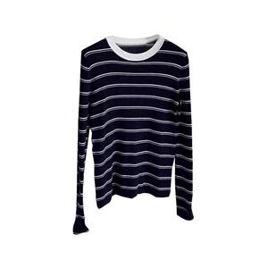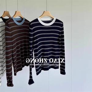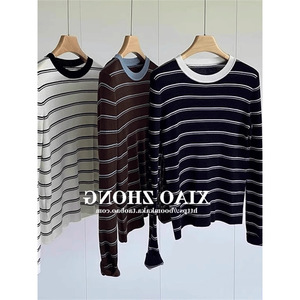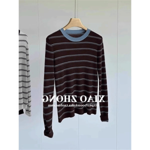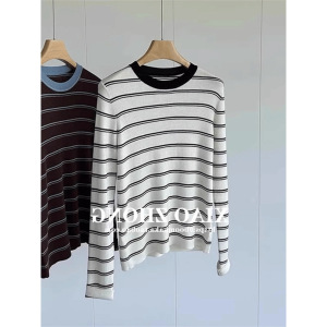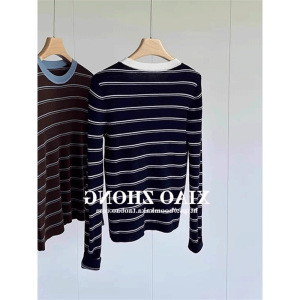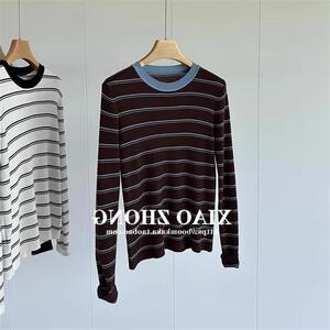 秋季新款简约百搭条纹针织打底衫撞色领口圆领长袖显瘦针织衫女