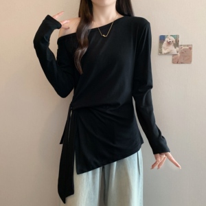 早秋2025新款露肩条纹长袖T恤大码女装不规则收腰绑带打底衫上衣