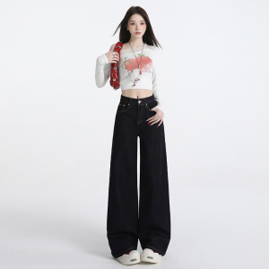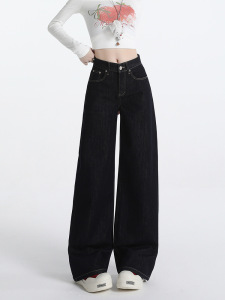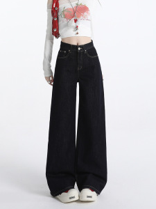 深蓝色美式阔腿牛仔裤女2025秋冬新款高腰显瘦设计感百搭拖地裤子