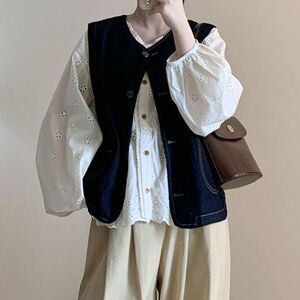 【两件套】牛仔马甲+镂空衬衫