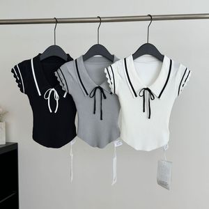 港味风格海军领蝴蝶结针织衫女减龄修身短袖T恤显瘦飞飞袖上衣潮