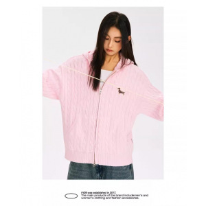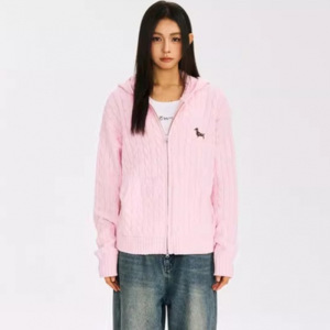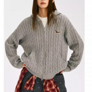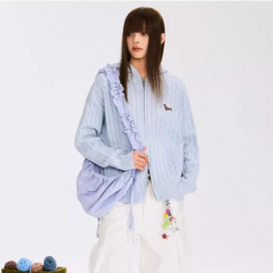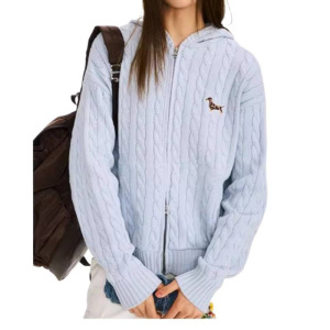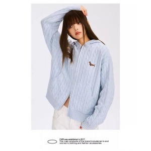 美式休闲连帽蓝色针织开衫毛衣春装女宽松外穿慵懒风早春外套上衣