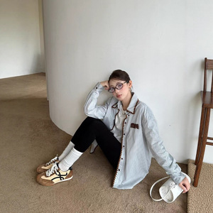 深圳南油早秋款M系字母贝壳针条纹开衫衬衫女宽松休闲百搭上衣女