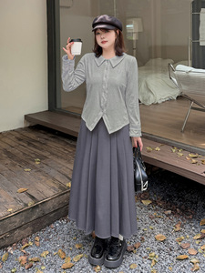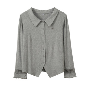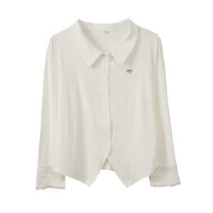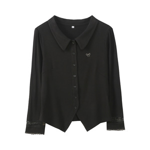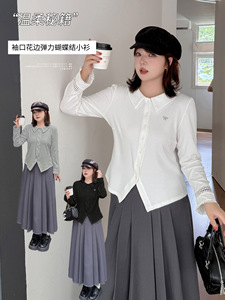伊诺大码女装polo领甜美花边长袖T恤2025秋季新款开衫上衣333183