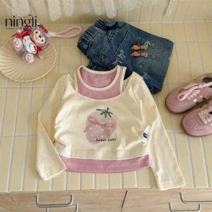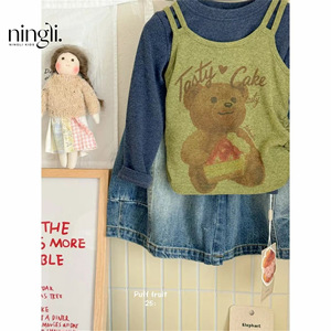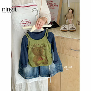 柠里女童秋季韩版套装新款儿童宝宝洋气卡通假两件吊带上衣牛仔裤