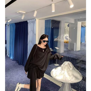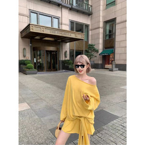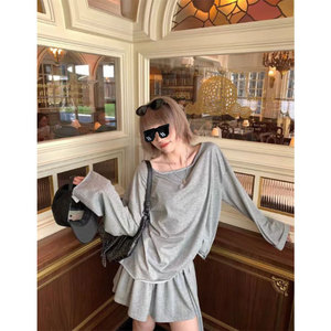 区区欧阳 露肩长袖T恤设计感小众慵懒宽松辣妹露肩上衣裤裙套装