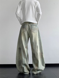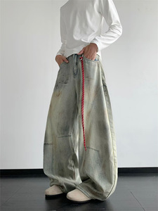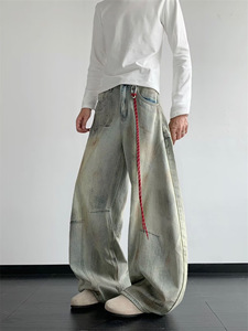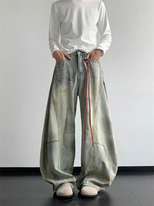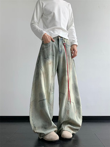 美式复古脏染做旧阔腿弯刀牛仔裤男拼接设计解构水洗直筒拖地长裤