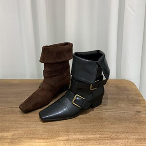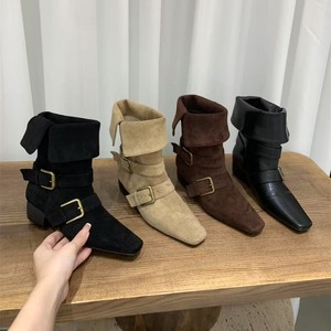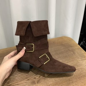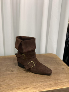 粗跟复古绒面西部牛仔靴短靴女靴子2025新款春秋季单靴方头马丁靴