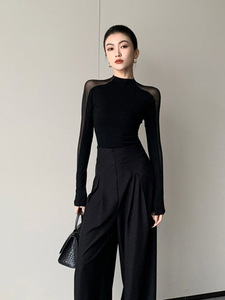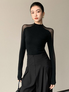 微透网纱拼接黑色上衣女夏季御姐高级新款小衫紧身别致长袖t恤潮
