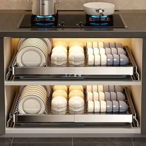 不锈钢橱柜拉篮厨房抽屉式沥水架免打孔抽拉可伸缩碗碟收纳架