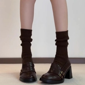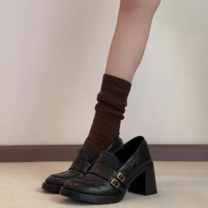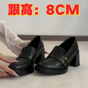 现货秒发~英伦风复古粗跟小皮鞋高跟乐福鞋女深口单鞋一脚蹬女鞋