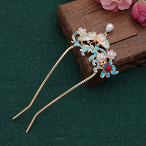 新中式蝶恋花珍珠发簪U形发钗 女高级感盘发簪子古风宫廷头饰