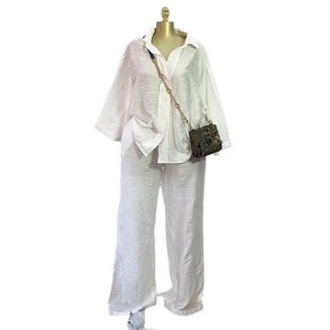 欧美女装2025秋季新款甜美清新宽松大码衬衫高腰直筒长裤两件套
