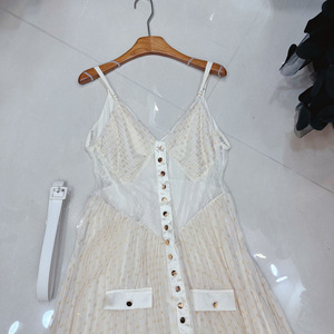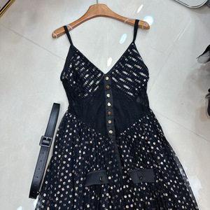 十三行慵懒御姐高级金丝排扣波点吊带V领压褶设计连衣裙A2#8515