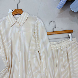 南油欧美澳洲法式小众翻领竖条纹长袖衬衫+条纹休闲长裤套装