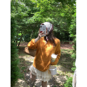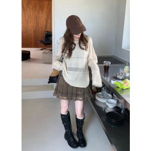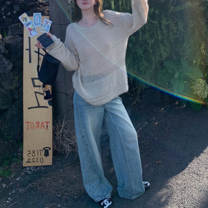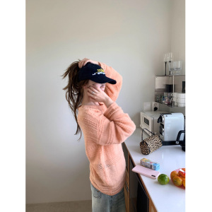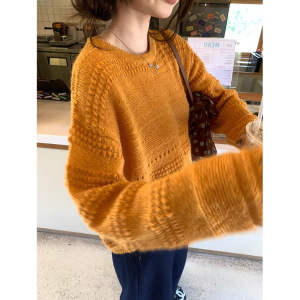 闲暇周末~马海毛镂空提花圆领针织衫女秋宽松慵懒针织罩衫纯色款
