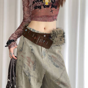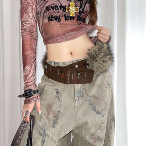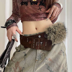 复古手工缝制纽扣皮毛一体宽版腰带女小众y2k辣妹风棕色腰封配饰