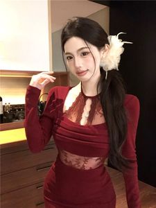 大码胖mm纯欲风蕾丝拼接挂脖连衣裙女秋冬长袖修身收腰包臀短裙子
