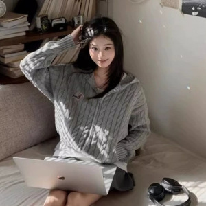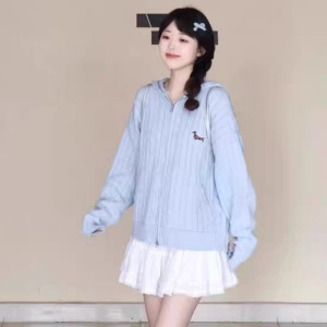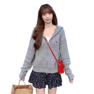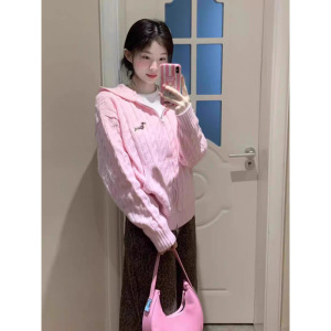 韩系穿搭粉色麻花连帽开衫毛衣女秋款宽松外穿慵懒风针织上衣