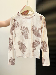 高级感独特印花长袖网纱防晒罩衫早秋修身OL风薄打底衫超好看T恤