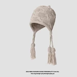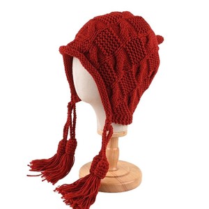 新年红色帽子圣诞节女秋冬保暖毛线流苏套头帽手工针织护耳帽日系