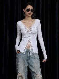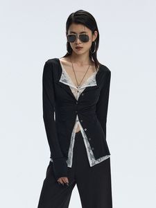 假两件粉色蕾丝拼接T恤女早秋修身内搭打底衫设计感小众短款上衣