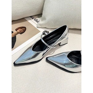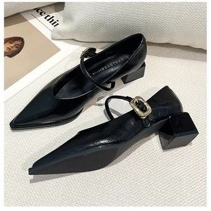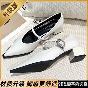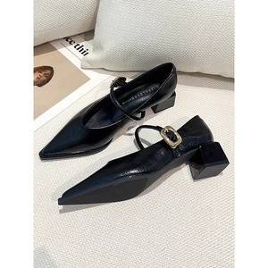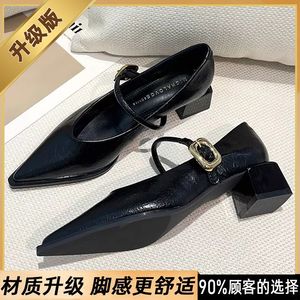 尖头职业黑色高跟鞋女春秋新款法式复古一字带粗跟玛丽珍单鞋