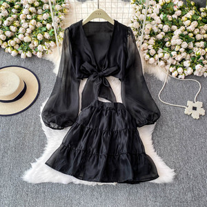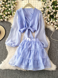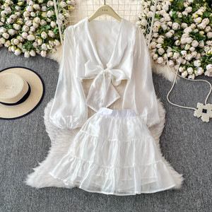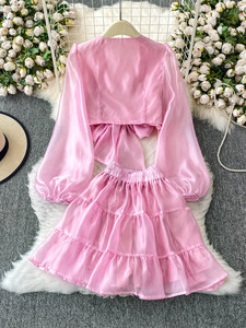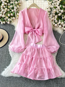 度假温柔风粉色短款亮面蝴蝶结V领长袖外套+高腰显瘦蛋糕短裙套装