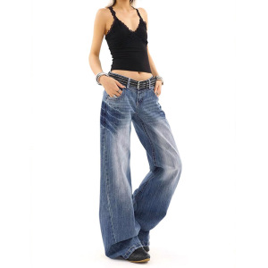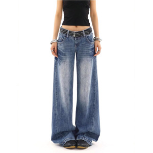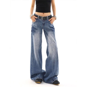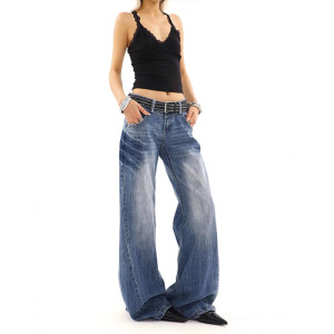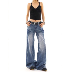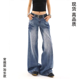 美式复古慵懒感水洗褶皱牛仔裤女2025夏季新款高腰显瘦宽松阔腿裤