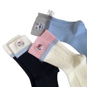 卡通刺绣猫咪袜子女春秋冬季可爱搞怪猫猫头中筒袜韩版拼色堆堆袜
