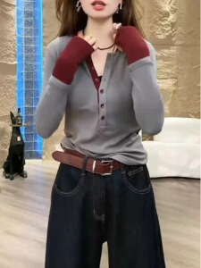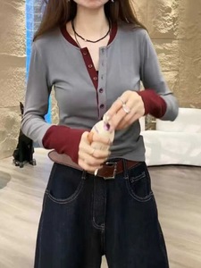 纯棉复古撞色长袖t恤女2025早秋新款大码胖MM修身内搭打底衫上衣