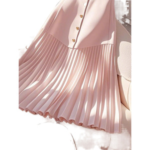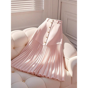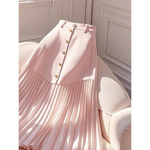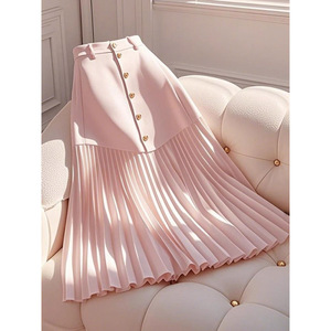 今年流行独特漂亮梨型身材高腰遮胯显瘦粉色拼接百褶字半身裙女
