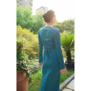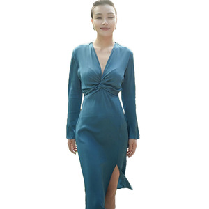 设计感小众v领长袖蓝色连衣裙女2025秋季新款修身显瘦气质包臀裙