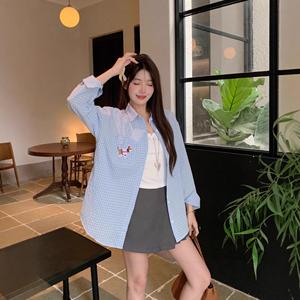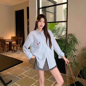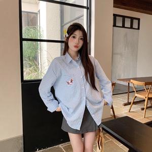 蓝色休闲腊肠狗刺绣格子衬衫女2025春秋宽松百搭小众叠穿上衣外套