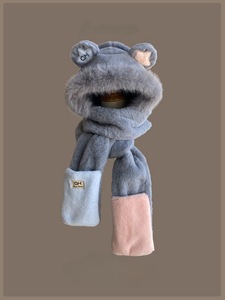 毛绒小熊耳朵帽子围巾手套一体三件套可爱女冬季骑车护耳保暖围脖