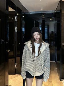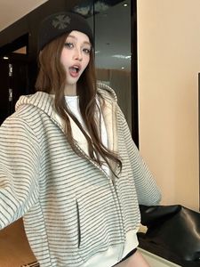 【工厂现货】美式氛围感宽松条纹开衫连帽卫衣女休闲长袖外套女潮