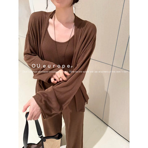 OU-秋上新针织开衫+纯色吊带背心+松紧腰直筒休闲裤套装0661